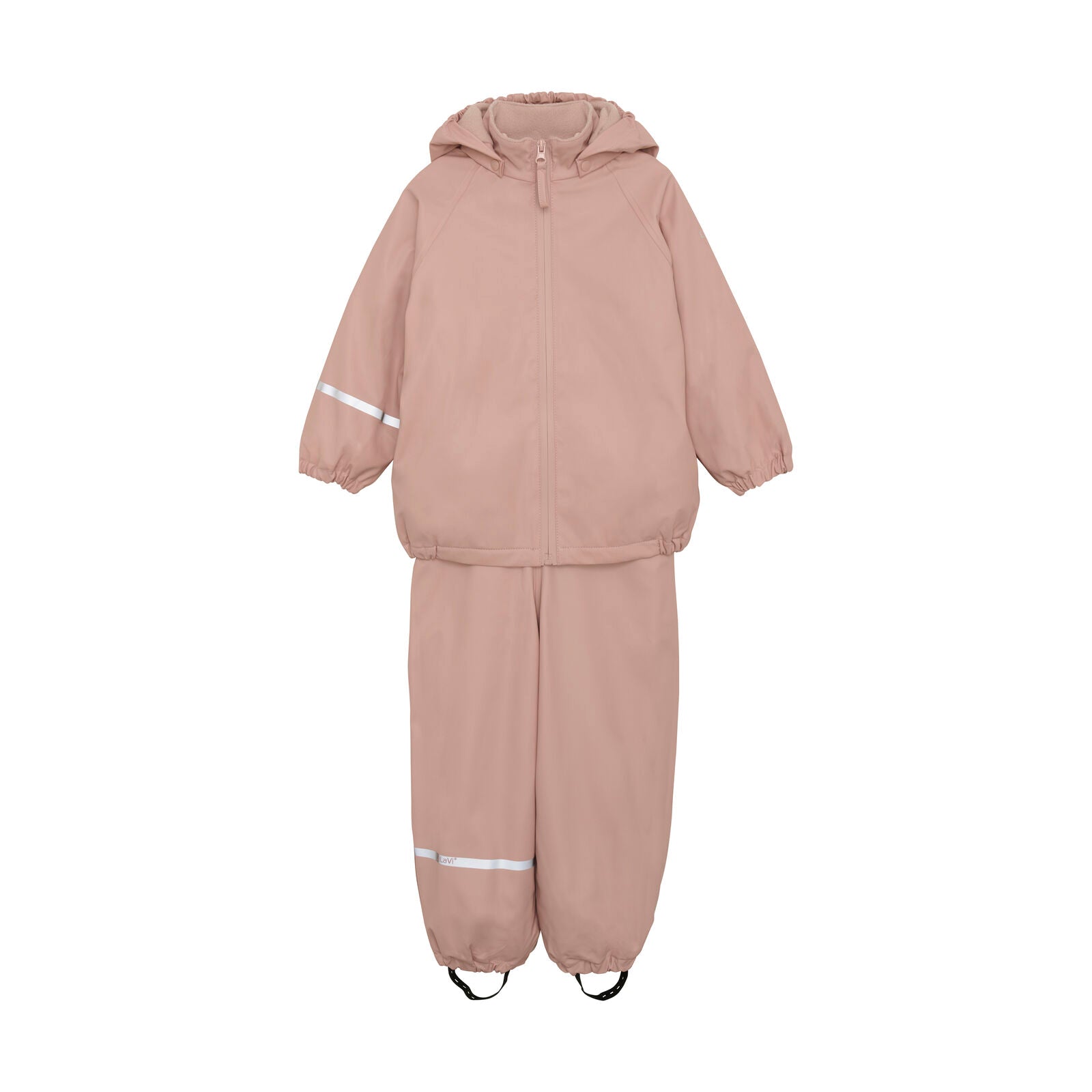 Hagnýtt regnfatasett með regnbuxum og regnjakka frá CeLaVi úr endurunnu PU. Til og með stærð 104 eru regnbuxurnar gerðar sem gallar með axlaböndum með plastsylgju að framan. Þeir eru með smellum til að loka á hliðunum. Stærð 110 og uppúr eru mittisbuxur með teygju í mitti. Báðar útgáfurnar eru með endurskinsmerki á fótleggnum og hagnýtum stígvélabönd. Regnjakkinn er með hettu sem hægt er að taka af, lokast með rennilás með vindstöng sem er með smellum að framan og er með teygju á úlnliðum. Endurskinsmerki á annarri ermi. Regnfatasettið er með 10.000 mm vatnssúluþrýstingi og er algjörlega vatnshelt.